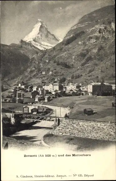 Ak Zermatt Kanton Wallis Schweiz, Blick auf den Ort mit Matterhorn