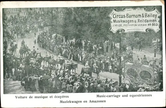 Ak Zirkus Barnum & Bailey, Musikwagen und Reitdamen, Zuschauer