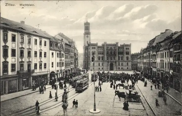 Ak Zittau in der Oberlausitz, Marktplatz, Straßenbahn, Pferdekutsche