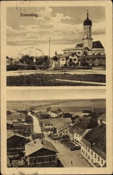 Ak Zorneding in Oberbayern, Ortspartie, Kirche, Denkmal
