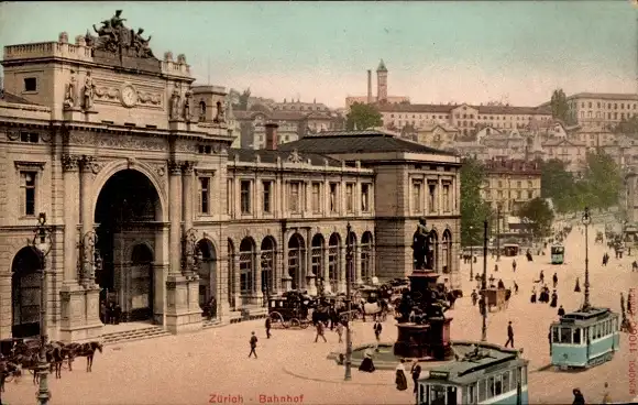 Ak Zürich Schweiz, Bahnhofsgebäude, Straßenbahn, Denkmal