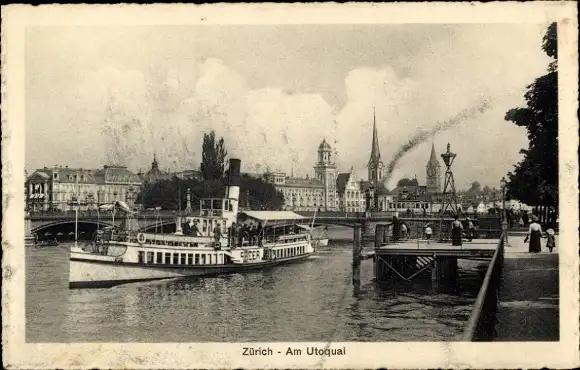 Ak Zürich Stadt Schweiz, Altstadtansicht, Dampfschiff, Utoquai, Kirchen