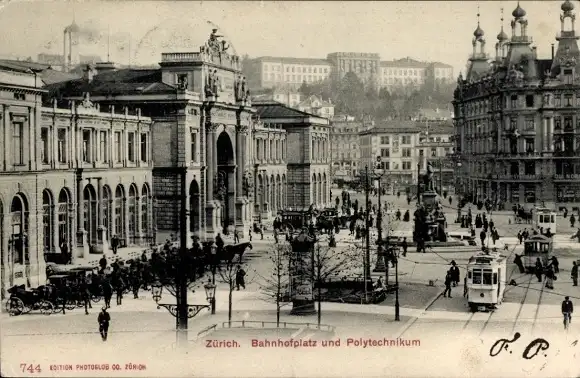 Ak Zürich Stadt Schweiz, Bahnhofplatz, Polytechnikum, Straßenbahnen