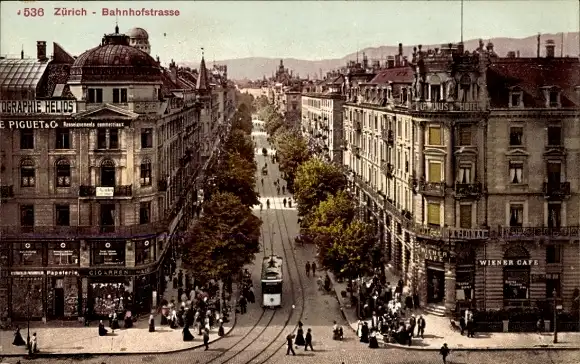 Ak Zürich Stadt Schweiz, Bahnhofstraße, Straßenbahn, Geschäfte