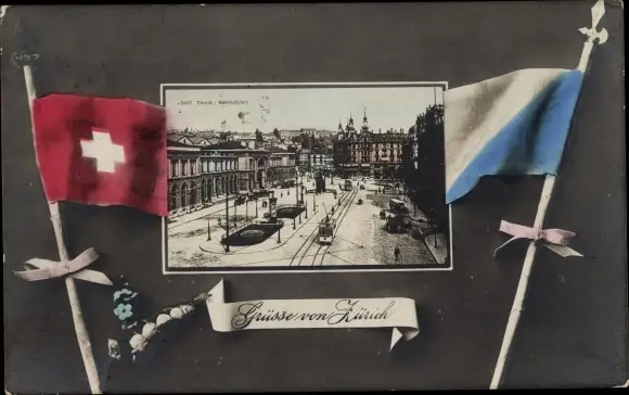 Ak Zürich Stadt Schweiz, Blick auf die Stadt, Fahnen