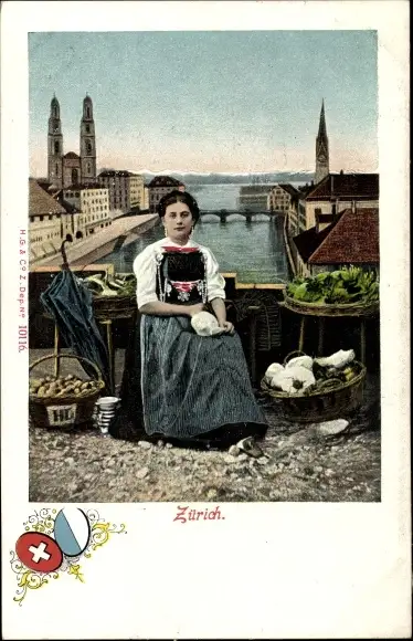 Ak Zürich Stadt Schweiz, Frau in schweizerischer Tracht, Brücke