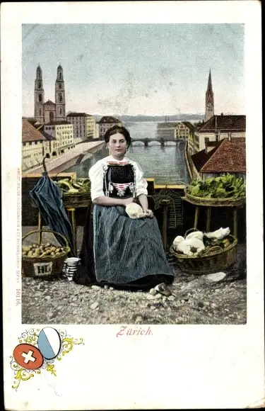 Ak Zürich Stadt Schweiz, Frau in schweizerischer Tracht, Brücke
