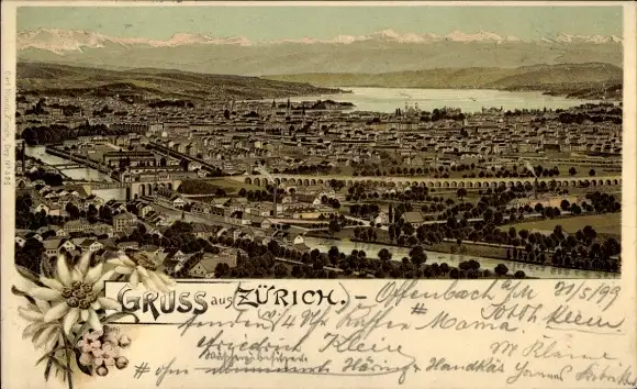 Ak Zürich Stadt Schweiz, Panoramaansicht von Fluss, Berge, Blumenmotiv