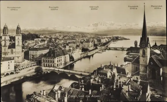 Ak Zürich Stadt Schweiz, Stadt, Brücken und Alpen