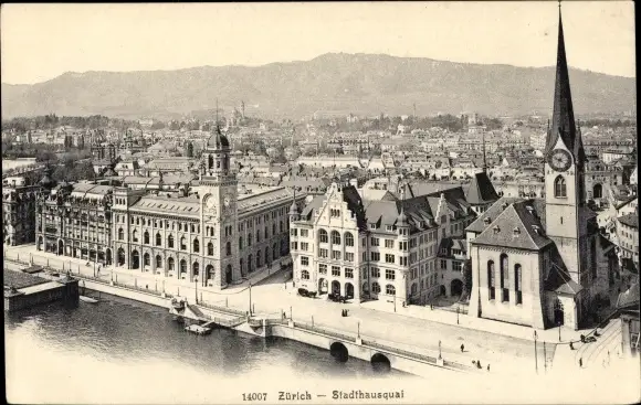 Ak Zürich, Stadthausquai, Kirchturm mit Uhr, Häuserreihen
