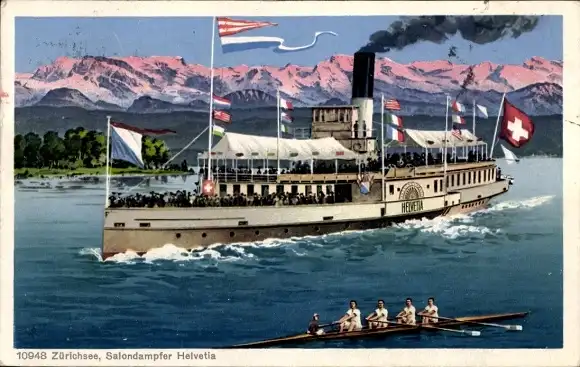 Ak Zürichsee, Salondampfer Helvetia,Flaggen, Alpen,Boot