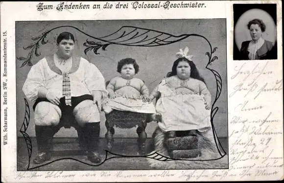 Ak Zum Andenken an die drei Colossal Geschwister, dicke Kinder, Portrait der Mutter