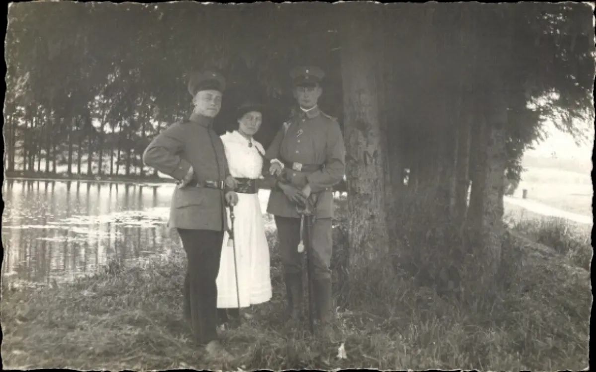 Ak Zwei Deutsche Soldaten in Uniform mit Frau, Flusspartie