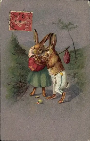 Ak Zwei Hasen in Kleidung, Liebespaar, Korb, Spaziergang