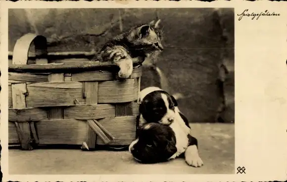 Ak Zwei Hunde schauen zu einer Katze in einem Korb hoch