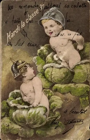 Ak Zwei Jungen in Kopfsalat, Pickelhaube, Humor