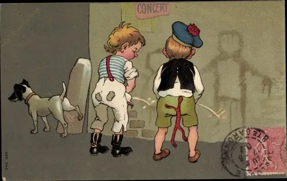 Ak Zwei Jungen pinkeln Figuren an eine Wand