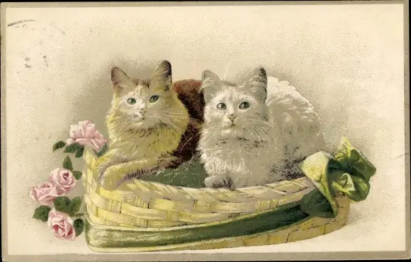 Ak Zwei Katzen, Korb, Rosen