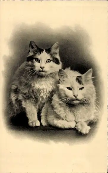 Ak Zwei Katzen, sitzend und liegend, Tierportrait
