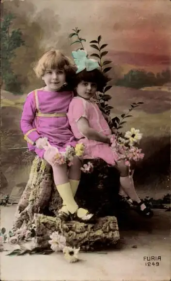 Ak Zwei Kinder sitzen auf einem Baumstumpf