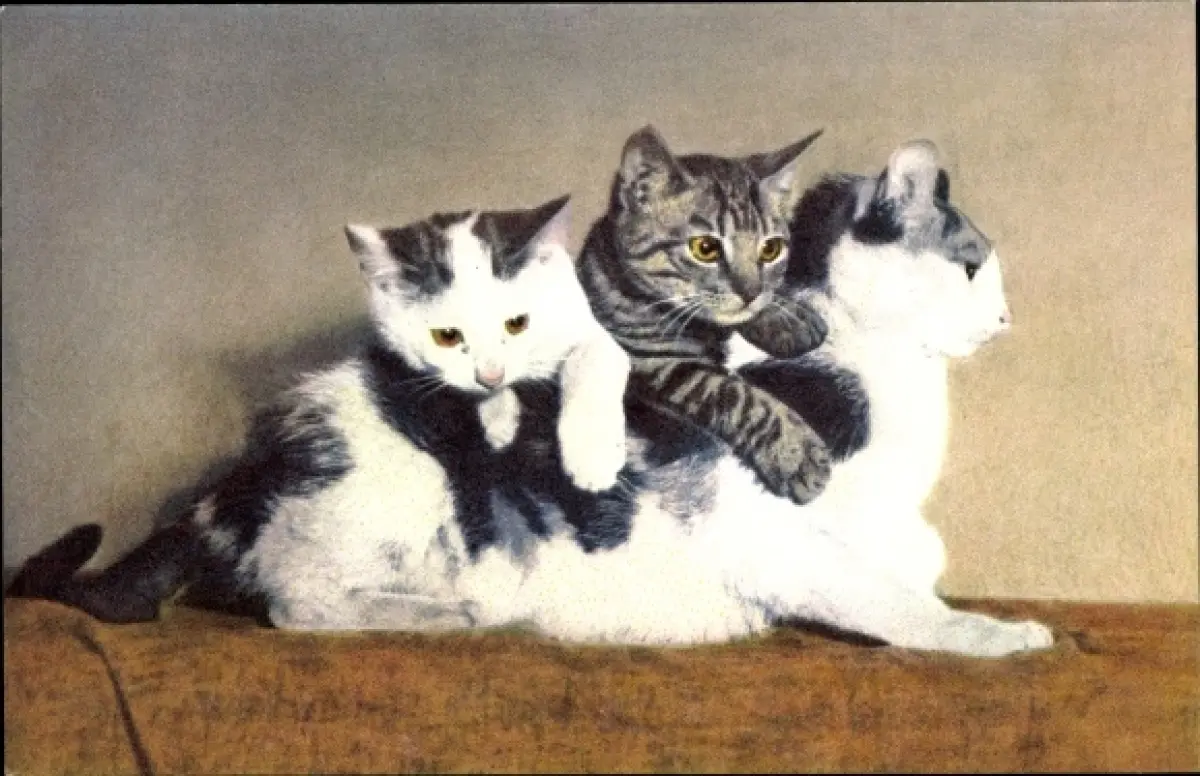 Ak Zwei Kitten auf dem Rücken der Katzenmutter