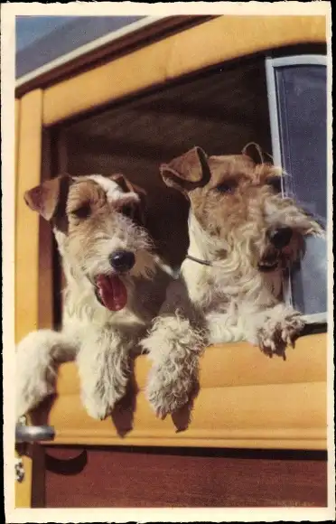Ak Zwei Terrier schauen aus einem Autofenster, Hundeportrait