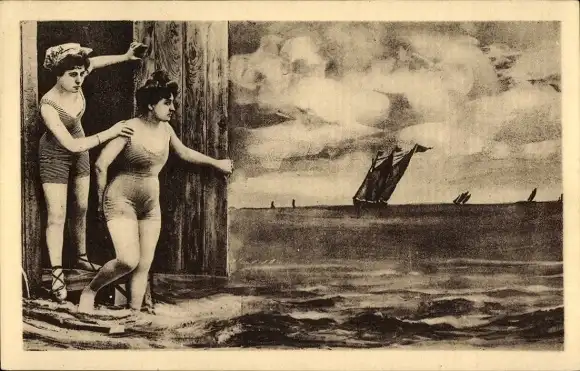 Ak Zwei junge Frauen in Badeanzügen stehen am Ufer