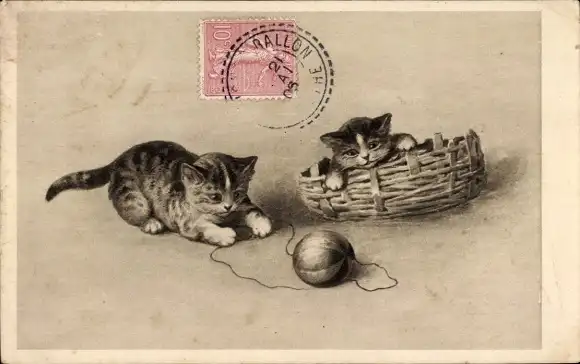 Ak Zwei junge Katzen, Korb, Wollknäuel