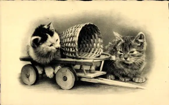 Ak Zwei junge Katzen, Spielzeug, Korb