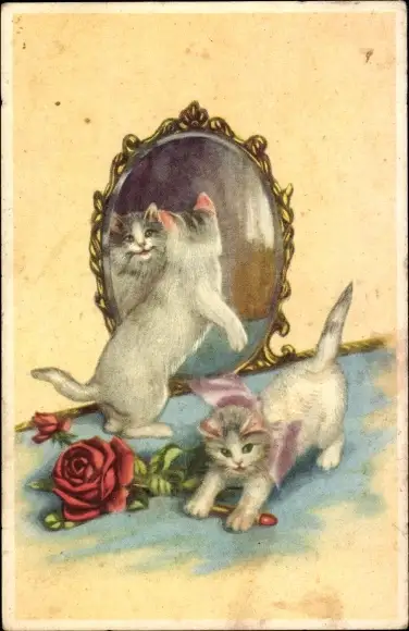 Ak Zwei kleine Katzen, Spiegel, Rose