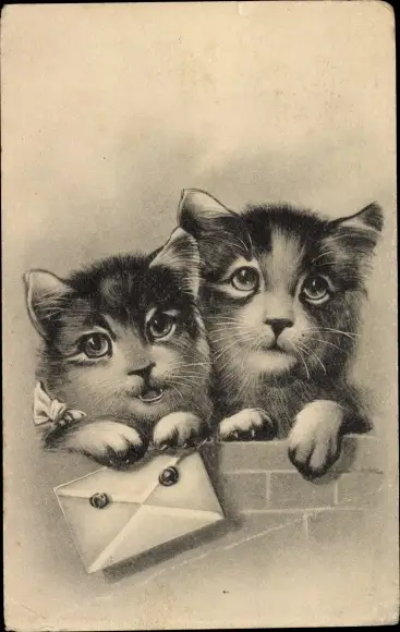 Ak Zwei kleine Katzen hinter einer Mauer mit Brief