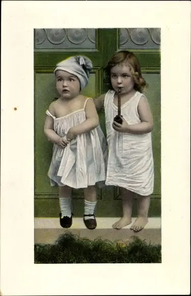 Ak Zwei kleine Kinder in Unterhemden, Pfeife