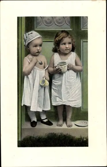 Ak Zwei kleine Kinder in Unterhemden, Tassen