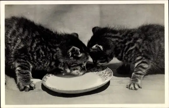 Ak Zwei kleine getigerte Hauskatzen, trinkend