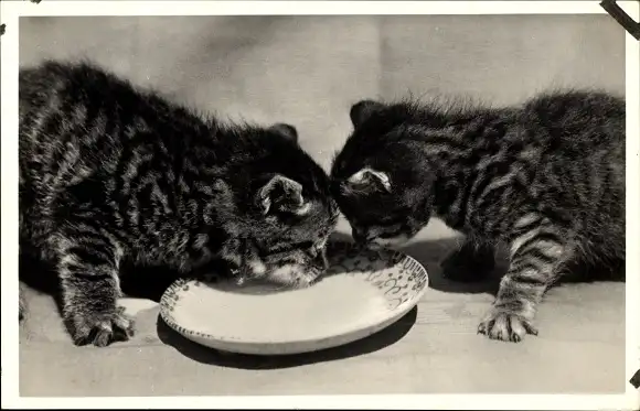 Ak Zwei kleine getigerte Hauskatzen, trinkend