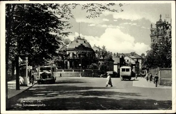 Ak Zwickau in Sachsen, Am Schumannplatz, Haltestellen mit Omnibussen