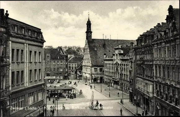 Ak Zwickau in Sachsen, Hauptmarkt, Rathaus, Stadttheater
