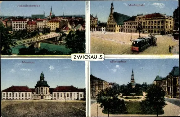 Ak Zwickau in Sachsen, Marktplatz, Albertplatz, Paradiesbrücke, Museum