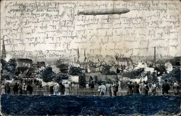 Ak Zwickau in Sachsen, Zeppelin-Luftschiff Viktoria Luise über der Stadt, 1912
