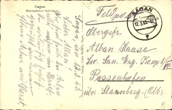 Zustand, siehe Scan, gelaufen, 1943 - ca 14 cm X 9 cm