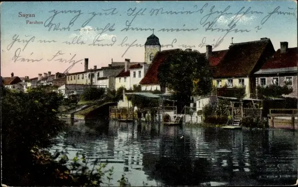 Ak Żagań Sagan Schlesien, Parchen, Flusspartie, Kirche