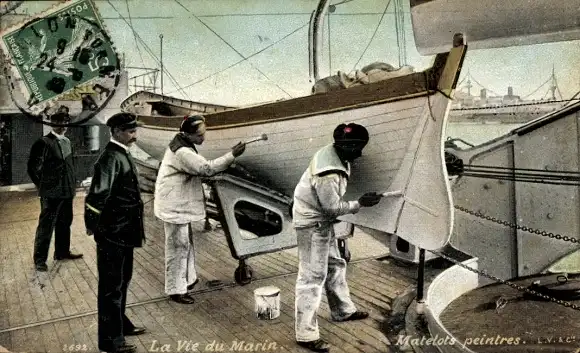 Ak französische Seeleute streichen Boot an, Kriegsschiff