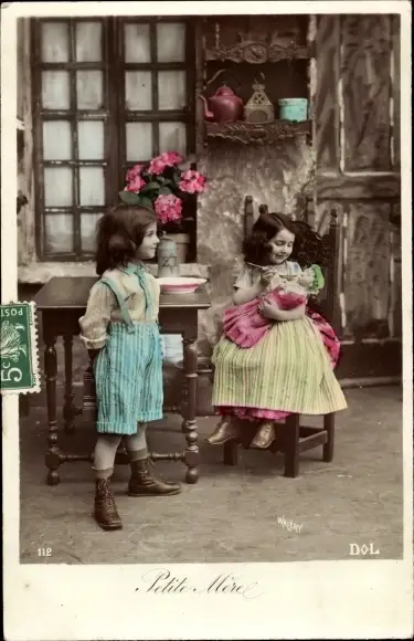 Ak kleines Mädchen füttert ihre Puppe, Junge