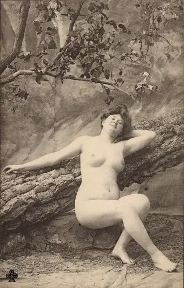 Ak sitzender Frauenakt, an einen Baumstamm gelehnt