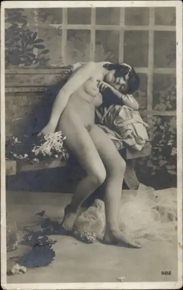 Ak sitzender Frauenakt, auf einer Steinbank, Blumen