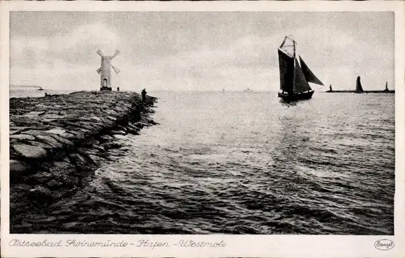 Ak Świnoujście Swinemünde Pommern, Hafen, Westmole, Segelboot, Windmühle