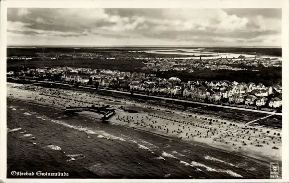 Ak Świnoujście Swinemünde Pommern, Luftaufnahme von Ostseebad, Strand mit Strandkörben