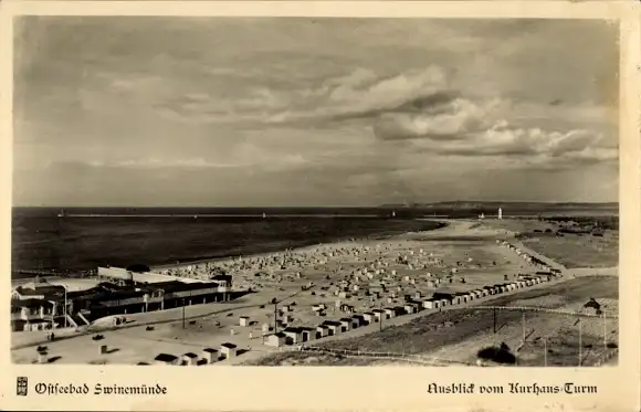 Ak Świnoujście Swinemünde Pommern, Ostseebad Ausblick vom Kurhaus Turm, Strand mit Strandkörben