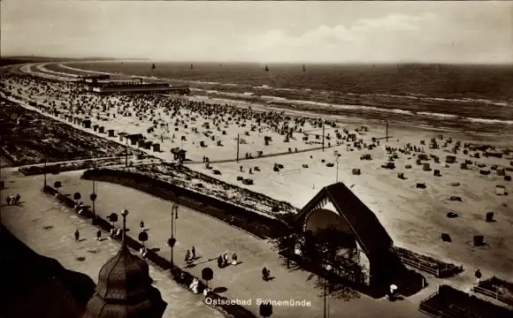 Ak Świnoujście Swinemünde Pommern, Ostseebad Strand mit vielen Strandkörben, Wellen, Bäume, Prom