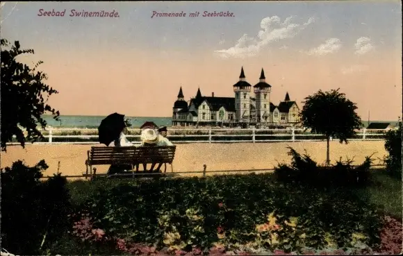 Ak Świnoujście Swinemünde Pommern, Promenade mit Seebrücke